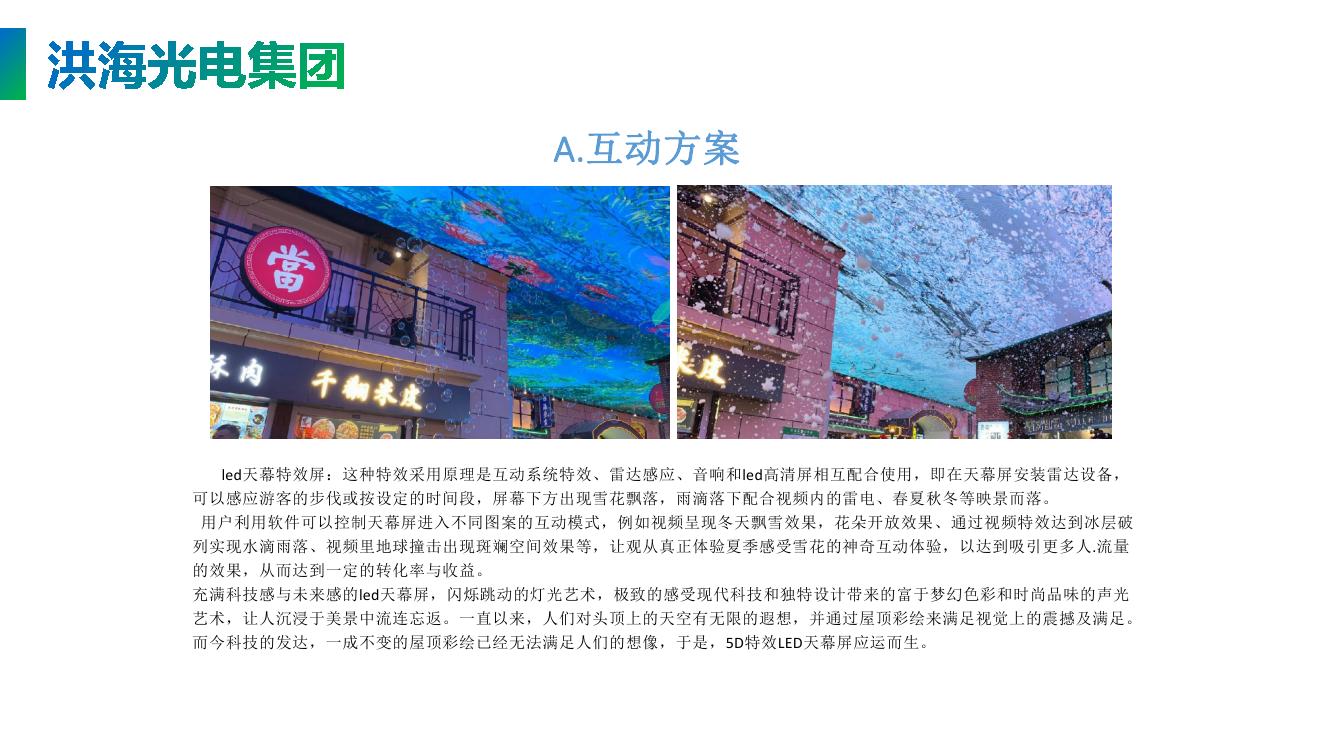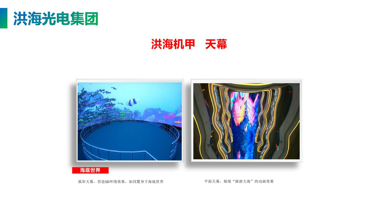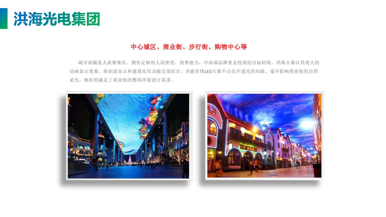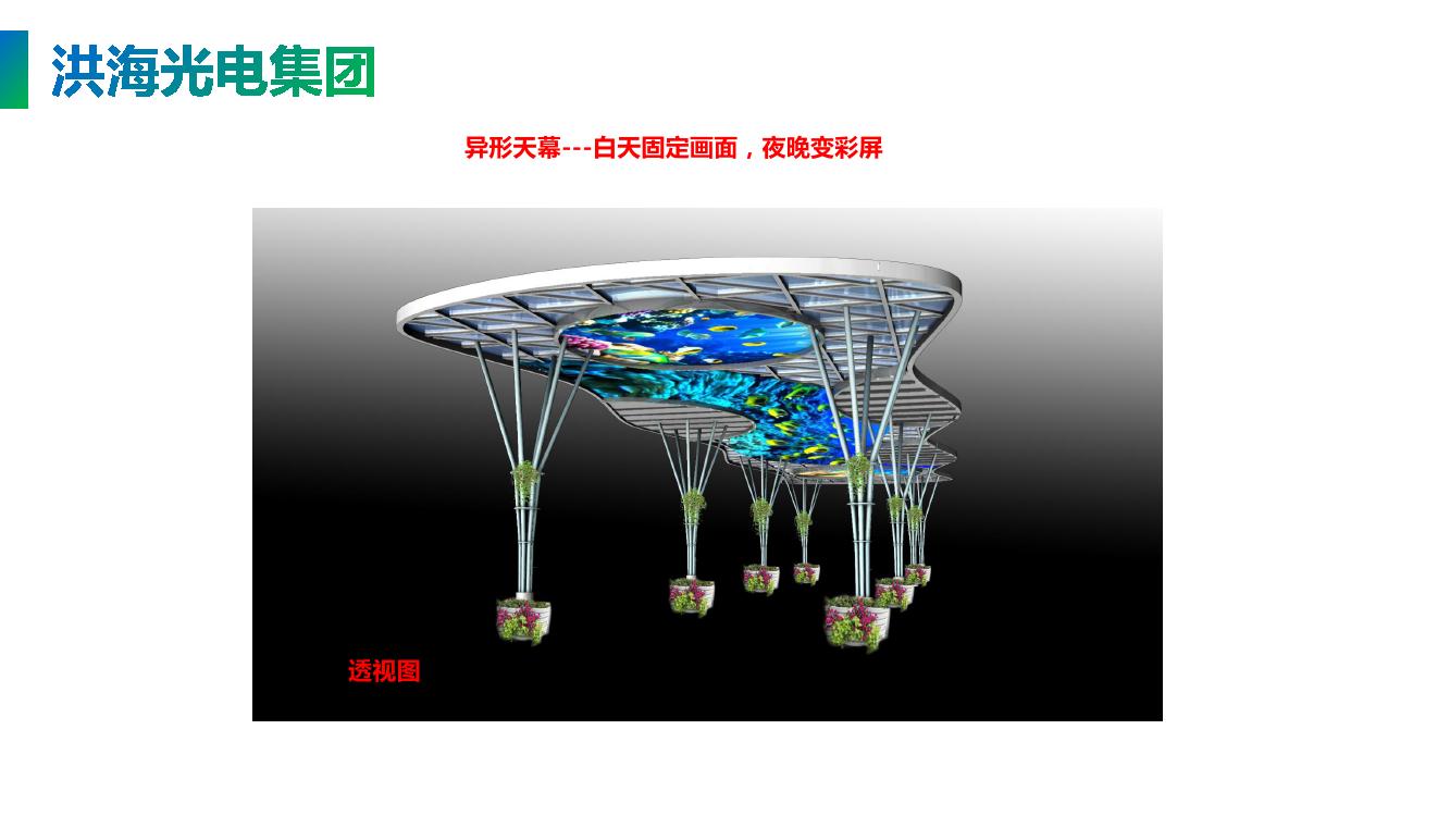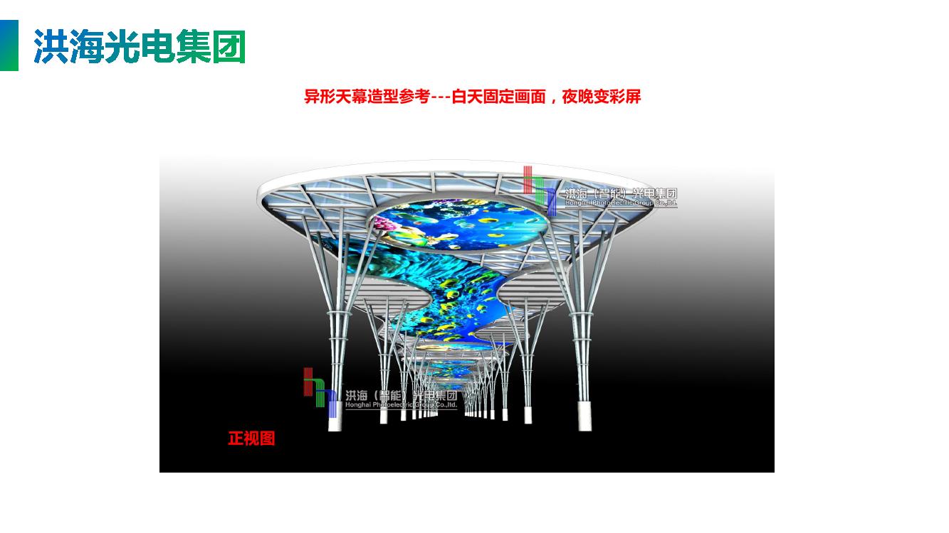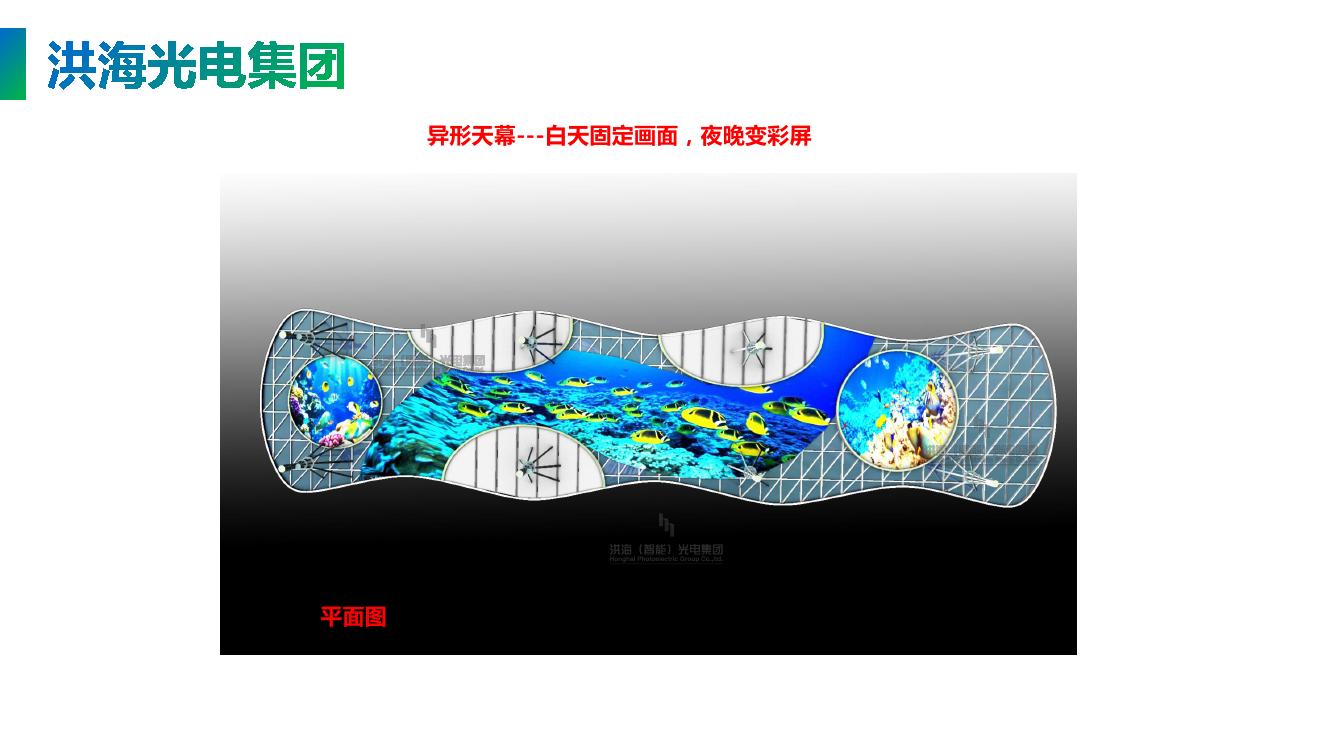 洪海LED天幕(彩色矩陣天幕)以其弧形式的設計占據整片外墻,蜿蜒起伏,白天具有很好的格柵裝飾效果,到了傍晚LED點亮,以其磅礴的視頻展現多彩的世界,在渲染商業地產氛圍的同時,聚集人氣提高商業地產的價值。